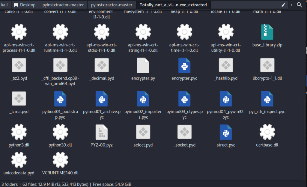 Bu sorunun çözümüne, verilen exe dosyasının içerisindeki kodları inceleyebilmek için pyinstxtractor aracını kullanarak başladım. Bu araç, exe dosyasını açarak içerisinden dosyaları çıkardı ve bu dosyalar arasında encrypt.pyc dosyasına rastladım.