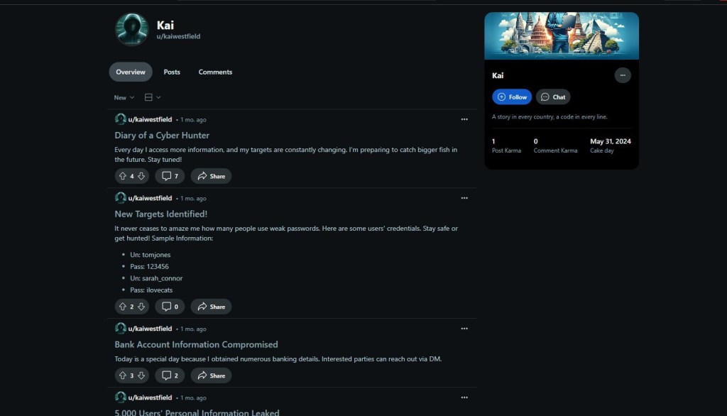 Sherlock, çeşitli sosyal medya hesaplarını bulmamı sağladı ve bunları tek tek incelemeye koyuldum. İlk olarak Reddit hesabına girdim, ancak burada kayda değer bir bilgiye ulaşamadım.