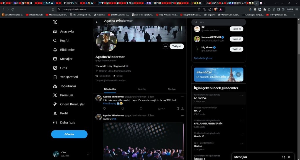 Bu sorunun çözümüne, Agatha Windermer adlı kişinin en son katıldığı konferansı bulmak için Google’da temel bir araştırma yaparak başladım. Araştırma sırasında Twitter hesabını buldum, ancak Twitter’daki paylaşımlar yeterince bilgi sağlamıyordu ve beni hedefime ulaştırmadı.