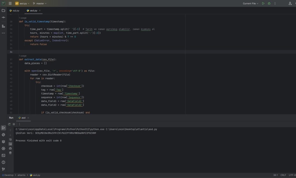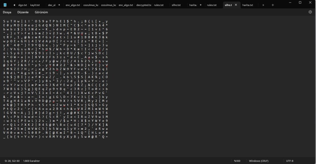 Soruda, bize içerisinde bir metin içeren bir txt dosyası verdi.Bu metinin geçmiş bilgilerimden vigenere cipher ile şifrelendiğini anladım.Fakat keyin ne olacağını bilmiyordum bende soru adı atlantis diye atlantisi denemek istedim ve bu metni Vigenère şifre çözme yöntemiyle başarıyla deşifre ettim.Deşifre edilmiş metin, çözüm sürecinde izlemem gereken kuralları açıklıyordu.